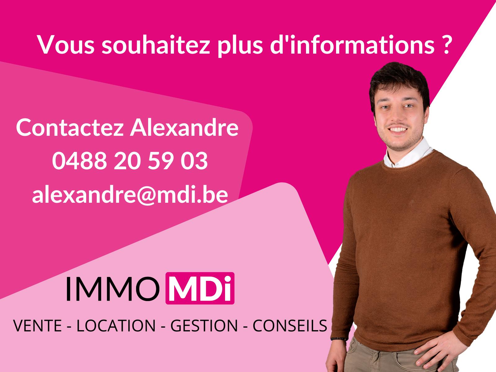 Visites et renseignements avec Alexandre au 0488 20 59 03 ou alexandre@mdi.be. Vous souhaitez vendre ou louer votre bien ? Contactez-nous au 02 353 24 30 pour une estimation sans engagement.